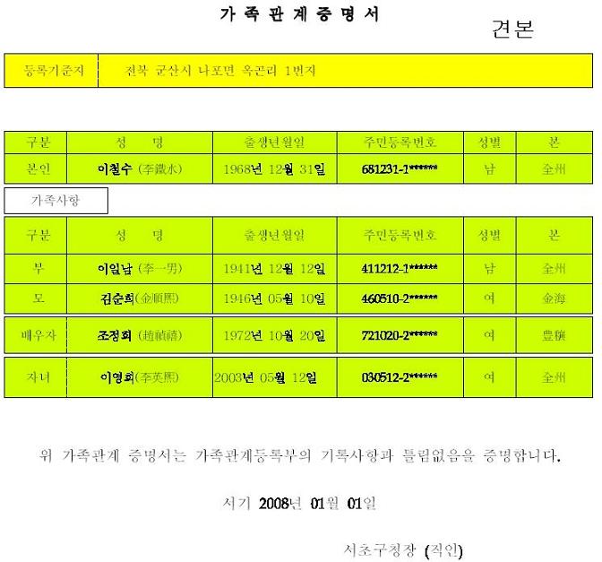대한민국 가족관계 등록부는 2007년 이전 호적을 갈음하여 2008년부터 활용되고 있는 공식 문서이라고 합니다. 2005년 헌법재판소에서 오래전 호주제도가 양성평등의 헌법정신에 위배된다고 판결함에 따라 2007년 5월 17일 가족관계등록법이 제정되었습니다. 가족관계등록법은 2008년 1월 1일부터 시행됐고 가족관계등록부는 하나만으로 작성되어 있고요.